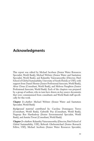 This report was edited by Michael Jacobsen (Senior Water Resources Specialist, World Bank), Michael Webster (Senior Water and Sanitation Specialist, World Bank), and Kalanithy Vairavamoorthy (Director, Patel School of Global Sustainability, University of South Florida or USF), with support from Daniel Shemie (Junior Professional Associate, World Bank), Alvar Closas (Consultant, World Bank), and Meleesa Naughton (Junior Professional Associate, World Bank). Each of the chapters was prepared by a group of authors, who in turn have drawn on key source documents that were commissioned from consultants and World Bank staff specifically for this work. Chapter 1—Author: Michael Webster (Senior Water and Sanitation Specialist, World Bank) Background material contributed by: Carolina Dominguez Torres (Consultant, World Bank), Gabrielle Puz (Consultant, World Bank), Nagaraja Rao Harshadeep (Senior Environmental Specialist, World Bank), and Asmita Tiwari (Consultant, World Bank) Chapter 2—Authors: Kalanithy Vairavamoorthy (Director, Patel School of Global Sustainability, USF), Kebreab Ghebremichael (Senior Research Fellow, USF), Michael Jacobsen (Senior Water Resources Specialist, xv