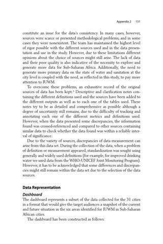 constitute an issue for the data’s consistency. In many cases, however, sources were scarce or presented methodological problems, and in some cases they were nonexistent. The team has maintained the highest level of rigor possible with the different sources used and in the data presentation and use in the study. However, due to these limitations different opinions about the choice of sources might still arise. The lack of data and their poor quality is also indicative of the necessity to explore and generate more data for Sub-Saharan Africa. Additionally, the need to generate more primary data on the state of water and sanitation at the city level is coupled with the need, as reflected in this study, to pay more attention to IUWM. To overcome these problems, an exhaustive record of the original sources of data has been kept.3 Descriptive and clarification notes containing the different definitions used and the sources have been added to the different outputs as well as to each one of the tables used. These notes try to be as detailed and comprehensive as possible although a degree of uncertainty still remains, due to the difficulty of tracking and annotating each one of the different metrics and definitions used. However, when the data presented some discrepancies, the information found was crossed-referenced and compared to other sources containing similar data to check whether the data found was within a reliable interval of significance. Due to the variety of sources, discrepancies of data measurement can arise from this data set. During the collection of the data, when a problem of definition or measurement appeared, standardization was sought using generally and widely used definitions (for example, for improved drinking water we used data from the WHO-UNICEF Joint Monitoring Program). However, it has to be acknowledged that some differences and discrepancies might still remain within the data set due to the selection of the data sources.