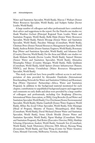 Water and Sanitation Specialist, World Bank), Marcus J. Wishart (Senior Water Resources Specialist, World Bank), and Sudipto Sarkar (Sector Leader, World Bank). A large number of colleagues and other professionals have contributed their advice and suggestions to the report. For the Nairobi case studies we thank Wambui Gichuri (Principal Regional Team Leader, Water and Sanitation Program, World Bank), Rafik Hirjii (Senior Water Resources Specialist, World Bank), Patrick Mwangi (Senior Water and Sanitation Specialist, World Bank), Pascaline Ndungu (Consultant, World Bank), Christian Peter (Senior Natural Resources Management Specialist, World Bank), Andreas Rohde (Senior Sanitary Engineer, World Bank), Rosemary Rop (Water and Sanitation Specialist, World Bank), and Johannes Zutt (Country Director, World Bank). For the Arua and Mbale case studies we thank Mukami Kariuki (Sector Leader, World Bank), Samuel Mutono (Senior Water and Sanitation Specialist, World Bank), Ahmadou Moustapha Ndiaye (Country Manager, World Bank), Halla Qaddumi (Consultant, World Bank), Adolf Spitzer (Senior Infrastructure Planner, NWSC), and Berina Uwimbabazi (Water Resources Management Specialist, World Bank). This study would not have been possible without access to and interpretation of data provided by Alexander Danilenko (International Benchmarking Network for Water and Sanitation Utilities) and Rosemary Rop (Water Operators’ Partnership—Africa, Water and Sanitation Program). In addition to the background material mentioned for each chapter, contributions to unpublished background papers and suggestions and comments on early drafts and ideas were provided by a large number of colleagues and professionals, including Ger Bergkamp (Director, International Water Association, or IWA), Greg Browder (Lead Water and Sanitation Specialist, World Bank), Uwe Deichman (Senior Environmental Specialist, World Bank), Martin Gambrill (Senior Water Engineer, World Bank), Abhas Jha (Lead Urban Specialist, World Bank), Felix Masangai (Head of Program, Ministry of Finance, Mozambique), Abel Mejia (Consultant, World Bank), David Michaud (Senior Water and Sanitation Specialist, World Bank), Soma Ghosh Moulik (Senior Water and Sanitation Specialist, World Bank), Ngoni Mudege (Consultant, Water and Sanitation Program), Paul Reiter (Executive Director, IWA), Matthijs Schuring (Operations Analyst, World Bank), Somnath Sen (Consultant, World Bank), Sarah Tibatemwa (Director, IWA Africa), Hyoung Wang (Economist, World Bank), and Tony Wong (Centre for Water Sensitive Cities, Monash University, Melbourne, Victoria, Australia).