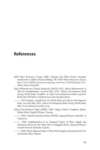 2030 Water Resources Group. 2009. Charting Our Water Future; Economic Frameworks to Inform Decision-Making. The 2030 Water Resources Group. http://www.2030waterresourcesgroup.com/water_full/Charting_Our_ Water_Future_Final.pdf. Africa Infrastructure Country Diagnostic (AICD). 2011. Africa’s Infrastructure: A Time for Transformation. Accessed May 2012. African Development Bank Group, World Bank. Available at: http://www.infrastructureafrica.org/aicd/ library/doc/552/africa’s-infrastructure-time-transformation. ———. N.D. Datasets compiled by the World Bank and African Development Bank. Accessed May 2012. African Development Bank Group, World Bank. http://www.infrastructureafrica.org/. African Development Bank (AfDB). 2004. Nigeria Project Completion Report. Ibadan Water Supply II Project. January. ———. 2005. Yaoundé Sanitation Project (PADY). Appraisal Report. Republic of Cameroon. ———. 2006. Implementation of an Integrated Project of Water Supply and Sanitation Services for the Urban Poor in Kagugube Parish. Appraisal Report. Central Division, Kampala, Uganda. ———. 2009. Project Appraisal Report: Urban Water Supply and Sanitation for Oyo and Taraba States. Nigeria.