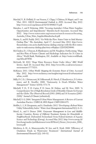 Marchal, V., R. Dellink, D. van Vuuren, C. Clapp, J. Château, B. Magné, and J. van Vliet. 2011. OECD Environmental Outlook to 2050. Accessed May 2012. http://www.oecd.org/dataoecd/32/53/49082173.pdf. Marsden, J., and P. Pickering. 2006. “Securing Australia’s Urban Water Supplies: Opportunities and Impediments.” Marsden-Jacob Associates. Accessed May 2012. http://www.watercentre.org/resources/search-resources/Securing_ Australia_Urban_Wate_SuppliesMarsdenJacob.pdf. Martin, S., and R. Puddy. 2012. “Go With the Flow: States Unite to Sink MurrayDarling Plan.” The Australian, April 17. Accessed May 2012. http://www. theaustralian.com.au/in-depth/murray-darling-crisis/go-with-the-flow-statesunite-to-sink-murray-darling-plan/story-e6frg6px-1226328230840. McCluskey, D., J. Duncan, B. Blankespoor, and M. Naughton. Forthcoming. “Maps and Box Plots of Future Climate and Hydrologic Indicators for 31 Cities in Africa.” World Bank, Washington, DC. Available at: http://water.worldbank. org/AfricaIUWM. McGrath, M. 2012. “Huge Water Resource Exists Under Africa.” BBC World Service, April 20. Accessed May 2012. http://www.bbc.co.uk/news/scienceenvironment-17775211. McKinsey. 2011. Urban World: Mapping the Economic Power of Cities. Accessed May 2012. http://www.mckinsey.com/insights/mgi/research/urbanization/ urban_world. Milly, P. C. D., J. Betancourt, M. Falkenmark, R. Hirsch, Z. Kundzewicz, D. Letten maier, and R. Stouffer. 2008. “Stationarity Is Dead—Whither Water Management?” Science 1(319): 573–74. Mitchell, T. D., T. D. Carter, P. D. Jones, M. Hulme, and M. New. 2003. “A Comprehensive Set of High-Resolution Grids of Monthly Climate for Europe and the Globe: The Observed Record (1901–2000) and 16 Scenarios (2001– 2100).” Journal of Climate (submitted). Mitchell, V. G. 2004. “Integrated Urban Water Management: A Review of Current Australian Practice. CSIRO & AWA Report: CMIT-2004-075. Moffitt, L. J., N. Zirogiannis, and A. Danilenko. 2012. “Developing a Robust Water Utility Vulnerability Index.” Water Asset Management International 8(1): 6–11. Morel, A., and S. Diener. 2006. Greywater Management in Low and MiddleIncome Countries, Review of Different Treatment Systems for Households or Neighbourhoods. Dubendorf, Switzerland: Swiss Federal Institute of Aquatic Science and Technology (Eawag). Accessed May 2012. http://www.eawag.ch/ forschung/sandec/publikationen/ewm/dl/Morel_Diener_Greywater_2006_ lowres.pdf. Mtethiwa, A. H., A. Munyenyembe, W. Jere, and E. Nyali. 2008. “Efficiency of Oxidation Ponds in Wastewater Treatment.” International Journal of Environmental Research 2(2): 149–52.