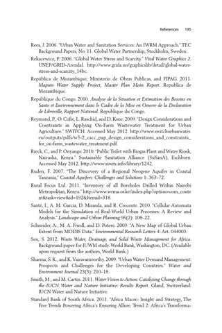 Rees, J. 2006. “Urban Water and Sanitation Services: An IWRM Approach.” TEC Background Papers, No. 11. Global Water Partnership, Stockholm, Sweden. Rekacewicz, P. 2006. “Global Water Stress and Scarcity.” Vital Water Graphics 2. UNEP/GRID-Arendal. http://www.grida.no/graphicslib/detail/global-waterstress-and-scarcity_14bc. República de Mozambique, Ministerio de Obras Publicas, and FIPAG. 2011. Maputo Water Supply Project, Master Plan Main Report. Republica de Mozambique. Repúblique du Congo. 2010. Analyse de la Situation et Estimation des Besoins en Sante et Environnement dans le Cadre de la Mise en Oeuvre de la Declaration de Libreville, Rapport National. Republique du Congo. Reymond, P., O. Cofie, L. Raschid, and D. Kone. 2009. “Design Considerations and Constraints in Applying On-Farm Wastewater Treatment for Urban Agriculture.” SWITCH. Accessed May 2012. http://www.switchurbanwater. eu/outputs/pdfs/w5-2_cacc_pap_design_considerations_and_constraints_ for_on-farm_wastewater_treatment.pdf. Rieck, C., and P. Onyango. 2010. “Public Toilet with Biogas Plant and Water Kiosk, Naivasha, Kenya.” Sustainable Sanitation Alliance (SuSanA), Eschborn. Accessed May 2012. http://www.sswm.info/library/1242. Ruden, F. 2007. “The Discovery of a Regional Neogene Aquifer in Coastal Tanzania,” Coastal Aquifers: Challenges and Solutions 1: 363–72. Rural Focus Ltd. 2011. “Inventory of all Boreholes Drilled Within Nairobi Metropolitan, Kenya.” http://www.wrma.or.ke/index.php?option=com_conte nt&task=view&id=192&Itemid=318. Santé, I., A. M. Garcia, D. Miranda, and R. Crecente. 2010. “Cellular Automata Models for the Simulation of Real-World Urban Processes: A Review and Analysis.” Landscape and Urban Planning 96(2): 108–22. Schneider, A., M. A. Friedl, and D. Potere. 2009. “A New Map of Global Urban Extent from MODIS Data.” Environmental Research Letters 4: Art. 044003. Sen, S. 2012. Waste Water, Drainage, and Solid Waste Management for Africa. Background paper for IUWM study. World Bank, Washington, DC. (Available upon request from the authors, World Bank.) Sharma, S. K., and K. Vairavamoorthy. 2009. “Urban Water Demand Management: Prospects and Challenges for the Developing Countries.” Water and Environment Journal 23(3): 210–18. Smith, M., and M. Cartin. 2011. Water Vision to Action: Catalyzing Change through the IUCN Water and Nature Initiative: Results Report. Gland, Switzerland: IUCN Water and Nature Initiative. Standard Bank of South Africa. 2011. “Africa Macro: Insight and Strategy, The Five Trends Powering Africa’s Ensuring Allure. Trend 2: Africa’s Transforma-