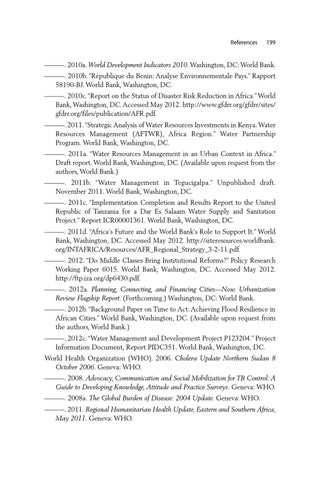 ———. 2010a. World Development Indicators 2010. Washington, DC: World Bank. ———. 2010b. “République du Benin: Analyse Environnementale Pays.” Rapport 58190-BJ. World Bank, Washington, DC. ———. 2010c. “Report on the Status of Disaster Risk Reduction in Africa.” World Bank, Washington, DC. Accessed May 2012. http://www.gfdrr.org/gfdrr/sites/ gfdrr.org/files/publication/AFR.pdf. ———. 2011. “Strategic Analysis of Water Resources Investments in Kenya. Water Resources Management (AFTWR), Africa Region.” Water Partnership Program. World Bank, Washington, DC. ———. 2011a. “Water Resources Management in an Urban Context in Africa.” Draft report. World Bank, Washington, DC. (Available upon request from the authors, World Bank.) ———. 2011b. “Water Management in Tegucigalpa.” Unpublished draft. November 2011. World Bank, Washington, DC. ———. 2011c. “Implementation Completion and Results Report to the United Republic of Tanzania for a Dar Es Salaam Water Supply and Sanitation Project.” Report ICR00001361. World Bank, Washington, DC. ———. 2011d. “Africa’s Future and the World Bank’s Role to Support It.” World Bank, Washington, DC. Accessed May 2012. http://siteresources.worldbank. org/INTAFRICA/Resources/AFR_Regional_Strategy_3-2-11.pdf. ———. 2012. “Do Middle Classes Bring Institutional Reforms?” Policy Research Working Paper 6015. World Bank, Washington, DC. Accessed May 2012. http://ftp.iza.org/dp6430.pdf. ———. 2012a. Planning, Connecting, and Financing Cities—Now. Urbanization Review Flagship Report. (Forthcoming.) Washington, DC: World Bank. ———. 2012b. “Background Paper on Time to Act: Achieving Flood Resilience in African Cities.” World Bank, Washington, DC. (Available upon request from the authors, World Bank.) ———. 2012c. “Water Management and Development Project P123204.” Project Information Document, Report PIDC351. World Bank, Washington, DC. World Health Organization (WHO). 2006. Cholera Update Northern Sudan 8 October 2006. Geneva: WHO. ———. 2008. Advocacy, Communication and Social Mobilization for TB Control: A Guide to Developing Knowledge, Attitude and Practice Surveys. Geneva: WHO. ———. 2008a. The Global Burden of Disease: 2004 Update. Geneva: WHO. ———. 2011. Regional Humanitarian Health Update, Eastern and Southern Africa, May 2011. Geneva: WHO.