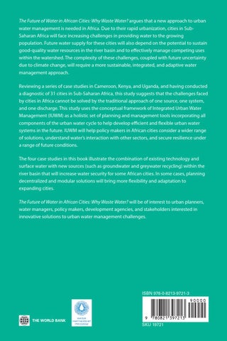 The Future of Water in African Cities: Why Waste Water? argues that a new approach to urban water management is needed in Africa. Due to their rapid urbanization, cities in SubSaharan Africa will face increasing challenges in providing water to the growing population. Future water supply for these cities will also depend on the potential to sustain good-quality water resources in the river basin and to effectively manage competing uses within the watershed. The complexity of these challenges, coupled with future uncertainty due to climate change, will require a more sustainable, integrated, and adaptive water management approach. Reviewing a series of case studies in Cameroon, Kenya, and Uganda, and having conducted a diagnostic of 31 cities in Sub-Saharan Africa, this study suggests that the challenges faced by cities in Africa cannot be solved by the traditional approach of one source, one system, and one discharge. This study uses the conceptual framework of Integrated Urban Water Management (IUWM) as a holistic set of planning and management tools incorporating all components of the urban water cycle to help develop efficient and flexible urban water systems in the future. IUWM will help policy makers in African cities consider a wider range of solutions, understand water’s interaction with other sectors, and secure resilience under a range of future conditions. The four case studies in this book illustrate the combination of existing technology and surface water with new sources (such as groundwater and greywater recycling) within the river basin that will increase water security for some African cities. In some cases, planning decentralized and modular solutions will bring more flexibility and adaptation to expanding cities. The Future of Water in African Cities: Why Waste Water? will be of interest to urban planners, water managers, policy makers, development agencies, and stakeholders interested in innovative solutions to urban water management challenges.