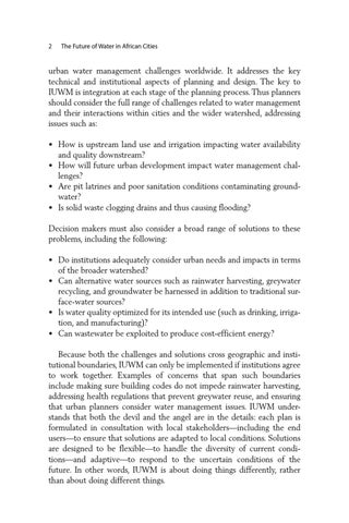 urban water management challenges worldwide. It addresses the key technical and institutional aspects of planning and design. The key to IUWM is integration at each stage of the planning process. Thus planners should consider the full range of challenges related to water management and their interactions within cities and the wider watershed, addressing issues such as: • How is upstream land use and irrigation impacting water availability and quality downstream? • How will future urban development impact water management challenges? • Are pit latrines and poor sanitation conditions contaminating groundwater? • Is solid waste clogging drains and thus causing flooding? Decision makers must also consider a broad range of solutions to these problems, including the following: • Do institutions adequately consider urban needs and impacts in terms of the broader watershed? • Can alternative water sources such as rainwater harvesting, greywater recycling, and groundwater be harnessed in addition to traditional surface-water sources? • Is water quality optimized for its intended use (such as drinking, irrigation, and manufacturing)? • Can wastewater be exploited to produce cost-efficient energy? Because both the challenges and solutions cross geographic and institutional boundaries, IUWM can only be implemented if institutions agree to work together. Examples of concerns that span such boundaries include making sure building codes do not impede rainwater harvesting, addressing health regulations that prevent greywater reuse, and ensuring that urban planners consider water management issues. IUWM understands that both the devil and the angel are in the details: each plan is formulated in consultation with local stakeholders—including the end users—to ensure that solutions are adapted to local conditions. Solutions are designed to be flexible—to handle the diversity of current conditions—and adaptive—to respond to the uncertain conditions of the future. In other words, IUWM is about doing things differently, rather than about doing different things.