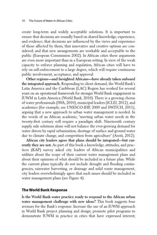 The World Bank Response Is the World Bank water practice ready to respond to the African urban water management challenge with new ideas? This book suggests four avenues for the Bank’s response: Increase the use of an IUWM approach in World Bank project planning and design; promote pilot programs to demonstrate IUWM in practice in cities that have expressed interest;
