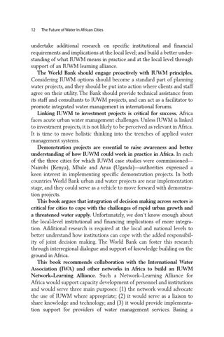 undertake additional research on specific institutional and financial requirements and implications at the local level; and build a better understanding of what IUWM means in practice and at the local level through support of an IUWM learning alliance. The World Bank should engage proactively with IUWM principles. Considering IUWM options should become a standard part of planning water projects, and they should be put into action where clients and staff agree on their utility. The Bank should provide technical assistance from its staff and consultants to IUWM projects, and can act as a facilitator to promote integrated water management in international forums. Linking IUWM to investment projects is critical for success. Africa faces acute urban water management challenges. Unless IUWM is linked to investment projects, it is not likely to be perceived as relevant in Africa. It is time to move holistic thinking into the trenches of applied water management systems. Demonstration projects are essential to raise awareness and better understanding of how IUWM could work in practice in Africa. In each of the three cities for which IUWM case studies were commissioned— Nairobi (Kenya), Mbale and Arua (Uganda)—authorities expressed a keen interest in implementing specific demonstration projects. In both countries World Bank urban and water projects are near implementation stage, and they could serve as a vehicle to move forward with demonstration projects. This book argues that integration of decision making across sectors is critical for cities to cope with the challenges of rapid urban growth and a threatened water supply. Unfortunately, we don’t know enough about the local-level institutional and financing implications of more integration. Additional research is required at the local and national levels to better understand how institutions can cope with the added responsibility of joint decision making. The World Bank can foster this research through interregional dialogue and support of knowledge building on the ground in Africa. This book recommends collaboration with the International Water Association (IWA) and other networks in Africa to build an IUWM Network–Learning Alliance. Such a Network–Learning Alliance for Africa would support capacity development of personnel and institutions and would serve three main purposes: (1) the network would advocate the use of IUWM where appropriate; (2) it would serve as a liaison to share knowledge and technology; and (3) it would provide implementation support for providers of water management services. Basing a