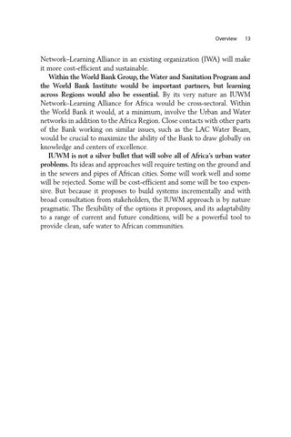 Network–Learning Alliance in an existing organization (IWA) will make it more cost-efficient and sustainable. Within the World Bank Group, the Water and Sanitation Program and the World Bank Institute would be important partners, but learning across Regions would also be essential. By its very nature an IUWM Network–Learning Alliance for Africa would be cross-sectoral. Within the World Bank it would, at a minimum, involve the Urban and Water networks in addition to the Africa Region. Close contacts with other parts of the Bank working on similar issues, such as the LAC Water Beam, would be crucial to maximize the ability of the Bank to draw globally on knowledge and centers of excellence. IUWM is not a silver bullet that will solve all of Africa’s urban water problems. Its ideas and approaches will require testing on the ground and in the sewers and pipes of African cities. Some will work well and some will be rejected. Some will be cost-efficient and some will be too expensive. But because it proposes to build systems incrementally and with broad consultation from stakeholders, the IUWM approach is by nature pragmatic. The flexibility of the options it proposes, and its adaptability to a range of current and future conditions, will be a powerful tool to provide clean, safe water to African communities.