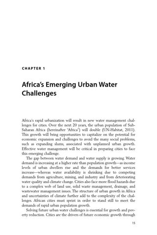 Africa’s rapid urbanization will result in new water management challenges for cities. Over the next 20 years, the urban population of SubSaharan Africa (hereinafter “Africa”) will double (UN-Habitat, 2011). This growth will bring opportunities to capitalize on the potential for economic expansion and challenges to avoid the many social problems, such as expanding slums, associated with unplanned urban growth. Effective water management will be critical in preparing cities to face this emerging challenge. The gap between water demand and water supply is growing. Water demand is increasing at a higher rate than population growth—as income levels of urban dwellers rise and the demands for better services increase—whereas water availability is shrinking due to competing demands from agriculture, mining, and industry and from deteriorating water quality and climate change. Cities also face more flood hazards due to a complex web of land use, solid waste management, drainage, and wastewater management issues. The structure of urban growth in Africa and uncertainties of climate further add to the complexity of the challenges. African cities must sprint in order to stand still to meet the demands of rapid urban population growth. Solving future urban water challenges is essential for growth and poverty reduction. Cities are the drivers of future economic growth through 15