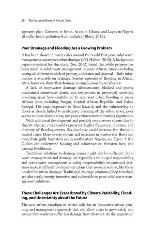 Poor Drainage and Flooding Are a Growing Problem It has been shown in many cities around the world that poor solid waste management can impact urban drainage (UN-Habitat, 2010). A background paper completed for this study (Sen, 2012) found that while progress has been made in solid waste management in some African cities—including testing of different models of primary collection and disposal—little information is available on drainage. Serious episodes of flooding in African cities, however, show that drainage is conspicuous by its absence. A lack of stormwater drainage infrastructure, blocked and poorly maintained stormwater drains, and settlements in previously unsettled low-lying areas have contributed to recurrent urban flooding in many African cities including Bangui, Central African Republic, and Dakar, Senegal. The large exposure to flood hazards and the vulnerability to floods is closely linked to inadequate planning of the urban space, poor access to more distant areas, and poor enforcement of existing regulations. With additional development and possibly more severe storms due to climate change, cities could experience higher frequency, duration, and intensity of flooding events. Sea-level rise could increase the threat in coastal cities. More severe storms and increases in wastewater flows can exacerbate gully formation (as in southeastern Nigeria, see Figure 1.10). Gullies can undermine housing and infrastructure, threaten lives, and damage livelihoods. Traditional solutions to drainage issues might not be sufficient. Solid waste management and drainage are typically a municipal responsibility and wastewater management a utility responsibility; institutional divisions make it difficult to implement plans that crosscut sectors, like those needed for urban drainage. Traditional drainage solutions (deep trenches) are also costly, energy intensive, and vulnerable to poor solid waste management solutions.