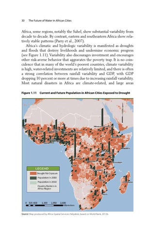 Africa, some regions, notably the Sahel, show substantial variability from decade to decade. By contrast, eastern and southeastern Africa show relatively stable patterns (Parry et al., 2007). Africa’s climatic and hydrologic variability is manifested as droughts and floods that destroy livelihoods and undermine economic progress (see Figure 1.11). Variability also discourages investment and encourages other risk-averse behavior that aggravates the poverty trap. It is no coincidence that in many of the world’s poorest countries, climate variability is high, water-related investments are relatively limited, and there is often a strong correlation between rainfall variability and GDP, with GDP dropping 10 percent or more at times due to increasing rainfall variability. Most natural disasters in Africa are climate-related, and large areas Figure 1.11 Current and Future Population in African Cities Exposed to Drought
