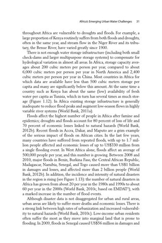 throughout Africa are vulnerable to droughts and floods. For example, a large proportion of Kenya routinely suffers from both floods and droughts, often in the same year, and stream flow in the Niger River and its tributary, the Benue River, have varied greatly since 1900. There is not enough water storage infrastructure (including both small check-dams and larger multipurpose storage systems) to compensate for hydrological variation in almost all areas. In Africa, storage capacity averages about 200 cubic meters per person per year, compared to about 6,000 cubic meters per person per year in North America and 2,400 cubic meters per person per year in China. Most countries in Africa for which data are available have less than 500 cubic meters storage per capita and many are significantly below this amount. At the same time a country such as Kenya has about the same (low) availability of fresh water per capita as Tunisia, which in turn has several times as much storage (Figure 1.12). In Africa existing storage infrastructure is generally inadequate to reduce flood peaks and augment low-season flows in highly variable river systems (World Bank, 2011a). Floods affect the highest number of people in Africa after famine and epidemics; droughts and floods account for 80 percent of loss of life and 70 percent of economic losses linked to natural hazards (World Bank, 2012b). Recent floods in Accra, Dakar, and Maputo are a grim example of the serious impact of floods on African cities. In the last few years, many countries have suffered from repeated floods, with up to 1.7 million people affected and economic losses of up to US$330 million from a single flooding event. In West Africa alone, floods affect an average of 500,000 people per year, and this number is growing. Between 2008 and 2010, major floods in Benin, Burkina Faso, the Central African Republic, Madagascar, Namibia, Senegal, and Togo caused more than US$1 billion in damages and losses, and affected more than 2 billion people (World Bank, 2012b). In addition, the incidence and intensity of natural disasters in the region is rising (see Figure 1.13): the number of natural disasters in Africa has grown from about 20 per year in the 1980s and 1990s to about 60 per year in the 2000s (World Bank, 2010c, based on EMDAT2), with a marked increase in the number of flood events. Although disaster data is not disaggregated for urban and rural areas, urban areas are likely to suffer more deaths and economic losses. There is a strong link between high rates of urbanization and increased vulnerability to natural hazards (World Bank, 2010c). Low-income urban residents often suffer the most as they move into marginal land that is prone to flooding. In 2009, floods in Senegal caused US$56 million in damages and
