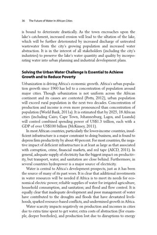 Solving the Urban Water Challenge Is Essential to Achieve Growth and to Reduce Poverty Urbanization is driving Africa’s economic growth. Africa’s urban population growth since 1960 has led to a concentration of population around major cities. Though urbanization is not uniform across the African continent and its causes are contested (Potts, 2012), urban population will exceed rural population in the next two decades. Concentration of production and income is even more pronounced than concentration of population (World Bank, 2011a). It is estimated that by 2025, 18 African cities (including Cairo, Cape Town, Johannesburg, Lagos, and Luanda) will control combined spending power of US$1.3 trillion, each with a GDP of over US$100 billion (McKinsey, 2011). In most African countries, particularly the lower-income countries, insufficient infrastructure is a major constraint to doing business, and is found to depress firm productivity by about 40 percent. For most countries, the negative impact of deficient infrastructure is at least as large as that associated with corruption, crime, financial markets, and red tape (AICD, 2011). In general, adequate supply of electricity has the biggest impact on productivity, but transport, water, and sanitation are close behind. Furthermore, in several countries hydropower is a major source of electricity. Water is central to Africa’s development prospects, just as it has been the source of many of its past woes. It is clear that additional investments in water resources will be needed if Africa is to meet its needs for economical electric power; reliable supplies of water for irrigated agriculture, household consumption, and sanitation; and flood and flow control. It is equally clear that inadequate development and poor management of water have contributed to the droughts and floods that have devastated livelihoods, sparked resource-based conflicts, and undermined growth in Africa. Water scarcity impacts negatively on production and incomes in cities due to extra time spent to get water, extra costs of abstraction (for example, deeper boreholes), and production lost due to disruptions to energy