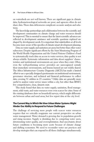 on watersheds are not well known. There are significant gaps in climate data; hydrometeorological networks are poor; and agencies often do not share data. These data deficiencies complicate accurate analysis and solutions. The knowledge partnerships and collaboration between the scientific and development communities on climate change and water resources should be improved. This is essential to ensure that the latest scientific advances are reflected in development assistance and scientific questions explored are shaped by development needs. It is important that stakeholders at all levels become more aware of the specifics of climate-smart development planning. Data on water supply and sanitation are poor, but better than other water subsectors. Despite significant efforts by the Joint Monitoring Program of the World Health Organization and the United Nations Children’s Fund to systematically track data on access to water services, data quality is not always reliable. Systematic information and data about suppliers’ characteristics and institutional environments are poor when they exist. Often, even the well-performing service providers are unrecognized outside their immediate environments, and lessons learned are not widely shared. The Africa Infrastructure Country Diagnostic (AICD) has made a limited effort to use a specially designed questionnaire on institutional environment, governance structure, and technical and financial performance to collect data covering 51 utilities in 23 countries.3 Utility data are generally more useful to analyze water service issues within a city, but other than IBNET, few comprehensive, clean, datasets exist. This study found that data on water supply, sanitation, flood management, solid waste, and water resources were even scarcer for cities. Some of the existing databases draw on household surveys, which might differentiate between urban and rural areas, but few report data at the city level.
