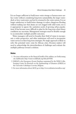 Notes 1. For more information on the financial health of the utilities, see forthcoming city dashboards. http://water.worldbank.org/AfricaIUWM. 2. EMDAT is the Emergency Events Database maintained by the WHO Colla borating Centre for Research on the Epidemiology of Disasters (CRED) at the Universite Catholique Louvain, Belgium. 3. For more information about AICD, go to http://www.infrastructureafrica.org/.