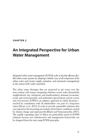 Integrated urban water management (IUWM) seeks to develop efficient, flexible urban water systems by adopting a holistic view of all components of the urban water cycle (water supply, sanitation, and stormwater management) in the context of the wider watershed. The urban water shortages that are projected to get worse over the next century will require integrating solutions across scales (household, neighborhood, city, catchment, and transboundary), domains (economic, social, and environmental), and institutions (government, private sector, and civil society). IUWM is an adaptive approach in which decisions— reached by consultation with all stakeholders—are part of a long-term vision (Howe et al., 2011). It seeks to provide sustainable solutions that can respond to the increasing uncertainty about future conditions created by climate change and rapid growth (Khatri and Vairavamoorthy, 2007). The rapidly expanding cities of Africa are particularly suited to IUWM solutions because new infrastructure and management frameworks can be designed from the start using IUWM principles.