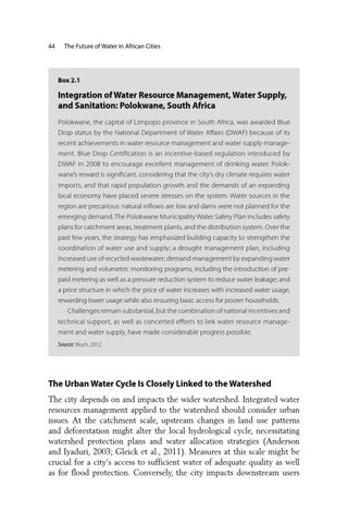 Integration of Water Resource Management, Water Supply, and Sanitation: Polokwane, South Africa Polokwane, the capital of Limpopo province in South Africa, was awarded Blue Drop status by the National Department of Water Affairs (DWAF) because of its recent achievements in water resource management and water supply management. Blue Drop Certification is an incentive-based regulation introduced by DWAF in 2008 to encourage excellent management of drinking water. Polokwane’s reward is significant, considering that the city’s dry climate requires water imports, and that rapid population growth and the demands of an expanding local economy have placed severe stresses on the system. Water sources in the region are precarious: natural inflows are low and dams were not planned for the emerging demand. The Polokwane Municipality Water Safety Plan includes safety plans for catchment areas, treatment plants, and the distribution system. Over the past few years, the strategy has emphasized building capacity to strengthen the coordination of water use and supply; a drought management plan, including increased use of recycled wastewater; demand management by expanding water metering and volumetric monitoring programs, including the introduction of prepaid metering as well as a pressure reduction system to reduce water leakage; and a price structure in which the price of water increases with increased water usage, rewarding lower usage while also ensuring basic access for poorer households. Challenges remain substantial, but the combination of national incentives and technical support, as well as concerted efforts to link water resource management and water supply, have made considerable progress possible. Source: Bloch, 2012.
