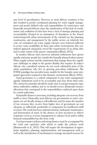 sary level of specialization. However, in most African countries, it has also resulted in poorly coordinated planning for water supply management and poorly defined roles and responsibilities. In water-scarce and financially stressed African cities, the ramifications of this lack of coordination and conflation of roles have been a lack of strategic planning and accountability. Steeped in an assumption of abundance in the former restricted-growth urban environments of the colonial era, the planning, construction, and management by the public sector—at relatively low cost—of centralized city water supply schemes were believed sufficient to secure water availability. In these past urban environments, this centralized approach adequately served the requirements of an urban elite, and to some extent of the poorer communities (Bloch, 2012). In modern African cities, however, informal settlements have grown rapidly, and many people live outside the formally planned urban system. Water supply systems and the institutions that manage them face significant challenges to adapt to the greater fluidity this requires. In today’s African city, centralized systems do not reach substantial parts of the urban populations who live in growing peri-urban settlements. The IUWM paradigm has provided some models for the broader, more integrated approaches required in this dynamic environment (Bloch, 2012). Good governance is a critical component to any water management agenda. Institutions need to be accountable and clear about their roles. The criteria for priorities should be made clear. Local governments, regulatory authorities, utilities, and so on should receive (financial) resource allocations that correspond to the responsibilities conferred upon them by central authorities. Sustainable finance is necessary, including adequate cost recovery from tariffs or taxes. Financially, most African city governments or water companies are not fiscally strong or self-sufficient, and for many the transfers of tax revenues they receive from higher tiers of government are not adequate or sufficiently predictable to compensate for insufficient tariff revenues. The result has been underinvestment, inadequate maintenance, and deterioration of assets. In the absence of clear incentives to deliver responsive services, revenue management to enhance local and/or utility financial sustainability has also been weak. Good governance policies and strong finance must be accompanied by the tools and capacities with which to make the policies work (Butterworth et al., 2011). This will require the development of appropriate legislative, planning, implementation, and management tools, as well as the introduction of mechanisms to manage increased revenue for