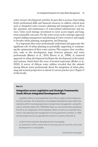 Integration across Legislative and Strategic Frameworks: South African Integrated Development Plans Legislative reform in post-apartheid South Africa sought to decentralize government activities. The introduction of integrated development plans (IDPs) represented a shift in municipal governance toward more management- and performance-oriented criteria. The 1998 White Paper on Local Government positioned the IDP as an integral part of the legislative reform as well as an essential instrument in the planning and management of local government activities. In 2000, the Municipal Services Act specified the minimum contents of the IDP as • a vision for the long-term development of a municipality • an assessment of the current level of servicing, and of economic and social development in a municipality (continued on next page)