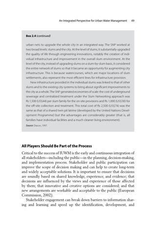 All Players Should Be Part of the Process Critical to the success of IUWM is the early and continuous integration of all stakeholders—including the public—in the planning, decision-making, and implementation process. Stakeholder and public participation can improve the scope of decision making and can help to create long-term and widely acceptable solutions. It is important to ensure that decisions are soundly based on shared knowledge, experience, and evidence; that decisions are influenced by the views and experience of those affected by them; that innovative and creative options are considered; and that new arrangements are workable and acceptable to the public (European Commission, 2002). Stakeholder engagement can break down barriers to information sharing and learning and speed up the identification, development, and