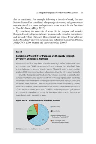 also be considered. For example, following a decade of work, the new Nairobi Master Plan considered a large range of options, and groundwater was introduced as a major and systematic water source for the first time in Nairobi’s history (Hirji, 2012). By combining the concepts of water fit for purpose and security through diversity, all potential water sources can be modeled to maximize end use and system efficiency. This approach can reduce fresh water use and costs and may improve environmental outcomes (Donkor and Wolde, 2011; GWP, 2010; Sharma and Vairavamoorthy, 2009).2