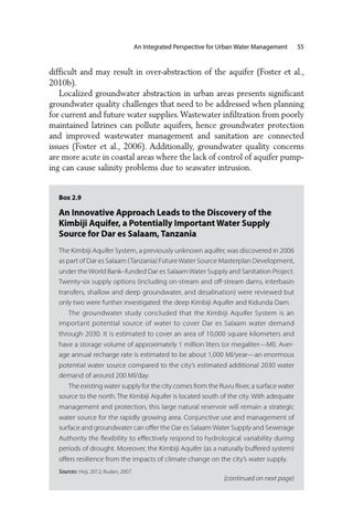 An Innovative Approach Leads to the Discovery of the Kimbiji Aquifer, a Potentially Important Water Supply Source for Dar es Salaam, Tanzania The Kimbiji Aquifer System, a previously unknown aquifer, was discovered in 2006 as part of Dar es Salaam (Tanzania) Future Water Source Masterplan Development, under the World Bank–funded Dar es Salaam Water Supply and Sanitation Project. Twenty-six supply options (including on-stream and off-stream dams, interbasin transfers, shallow and deep groundwater, and desalination) were reviewed but only two were further investigated: the deep Kimbiji Aquifer and Kidunda Dam. The groundwater study concluded that the Kimbiji Aquifer System is an important potential source of water to cover Dar es Salaam water demand through 2030. It is estimated to cover an area of 10,000 square kilometers and have a storage volume of approximately 1 million liters (or megaliter—Ml). Average annual recharge rate is estimated to be about 1,000 Ml/year—an enormous potential water source compared to the city’s estimated additional 2030 water demand of around 200 Ml/day. The existing water supply for the city comes from the Ruvu River, a surface water source to the north. The Kimbiji Aquifer is located south of the city. With adequate management and protection, this large natural reservoir will remain a strategic water source for the rapidly growing area. Conjunctive use and management of surface and groundwater can offer the Dar es Salaam Water Supply and Sewerage Authority the flexibility to effectively respond to hydrological variability during periods of drought. Moreover, the Kimbiji Aquifer (as a naturally buffered system) offers resilience from the impacts of climate change on the city’s water supply. Sources: Hirji, 2012; Ruden, 2007.