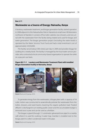 Wastewater as a Source of Energy: Naivasha, Kenya A lavatory, wastewater treatment, and biogas generation facility started operation in 2008 adjacent to the Naivasha Bus Park in Naivasha (a small town 90 kilometers northwest of Nairobi). It consists of five toilet cubicles, two showers, and one urinal with the wastewater from the facility being treated and used for biogas and water generation. The biogas generation project (including the water kiosk) is operated by the Water Services Trust Fund and had a total investment cost of approximately US$50,000. The facility served about 300 visitors per day in 2009 and provides biogas for cooking for a nearby kiosk. The facility is managed by the local water service provider, who contracted a local community-based organization to operate the toilet on a pay-per-use basis. Figure B2.11.1 Lavatory and Wastewater Treatment Plant with Installed Biogas Generation Facility in Naivasha, Kenya