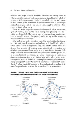 included. This might indicate that these cities face no scarcity issues or other reasons to consider wastewater reuse, or it might reflect a lack of awareness. Although most cities and utilities include informal settlements in their current plans, more than 20 percent of the cities in the sample moderately disagree with the inclusion of water supply to informal settlements in future urban plans. There is a wider range of actors involved in overall urban water management planning than in the water management planning done by a utility (see Figure 3.2). The current level of citizen and end user involvement is low (20 percent of responses) and advocacy will be needed to increase end user involvement. City leaders and water operators agree that emphasizing the importance of institutional structures and political will should help achieve better urban water management. City and utility leaders have also stressed the necessity of creating more institutional cooperation and developing institutional frameworks to help meet future planning challenges. However, these institutional arrangements have to be specific and fit in with the local and national governance structures. In some cases, decentralization practices or regulation laws might affect urban water management practices. In Dakar, for example, the municipality finds that incorporating additional water network maintenance responsibilities into the city’s urban plan is difficult due to decentralization laws and the division of responsibilities between the national and local government. Figure 3.2 Involved Parties in the Consultation Process of Urban Water Management: From the Municipality (Left) and Utility (Right) Viewpoints City's planning department