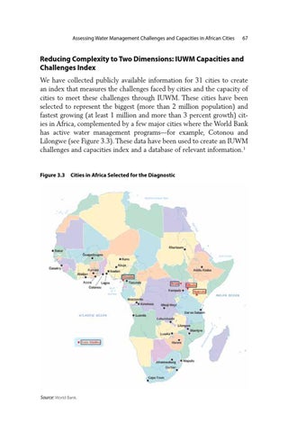 Reducing Complexity to Two Dimensions: IUWM Capacities and Challenges Index We have collected publicly available information for 31 cities to create an index that measures the challenges faced by cities and the capacity of cities to meet these challenges through IUWM. These cities have been selected to represent the biggest (more than 2 million population) and fastest growing (at least 1 million and more than 3 percent growth) cities in Africa, complemented by a few major cities where the World Bank has active water management programs—for example, Cotonou and Lilongwe (see Figure 3.3). These data have been used to create an IUWM challenges and capacities index and a database of relevant information.1