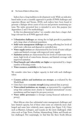 Indices have a long tradition in development work. While an indicatorbased index is not a scientific approach to predict IUWM challenges and capacities (Kraay and Tawara, 2010), such indices have been found to generate a dialogue about causes of success and promote monitoring systems. The index presented here is intended to serve this purpose (see Appendixes 2 and 3 for methodology). In this two-dimensional index,2 we consider cities have a larger challenge relevant for an IUWM approach when: • Urbanization challenges are strong due to high growth in population and a large share of informal population • Solid waste management challenges are strong reflecting low levels of solid waste collection and disposal in controlled sites • Water supply services are characterized by low levels of water sold per capita and limited coverage with improved water supply • Sanitation services are characterized by low levels of wastewater treatment, high levels of water-borne diseases, and limited coverage with improved sanitation • Flood hazards and vulnerability are higher as represented by a larger number of flooding events • Water resources availability in the basin is less. We consider cities have a higher capacity to deal with such challenges when: • Country policies and institutions are stronger, as evaluated by the World Bank • Cities have more economic strength (using national data as proxy) • Water-related institutions are stronger, as represented by a regulatory setup that conforms more closely to “standard international” recommendations and has targets for pro-poor services • Water utility governance is stronger (using financial indicators as proxy). Most African cities face substantial water management challenges and have limited capacity, but of these cities some are relatively more challenged and some have relatively more capacity (see Figure 3.4). Cities such as Blantyre, Lilongwe, and Luanda are the most challenged, while cities such as Cape Town, Durban, Johannesburg, Dakar, and Douala are less challenged. Not surprisingly, we find that the three South African