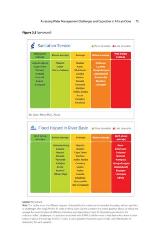 Source: World Bank. Note: The tables show the different degrees of desirability for a selection of variables illustrating either capacities or challenges affecting IUWM in 31 cities in Africa. Each column contains the overall position above or below the average for a combination of different indicators (see Appendixes 2 and 3). Depending on whether the indicators reflect challenges or capacities associated with IUWM, it will be more or less desirable to have a value below or above the average for the 31 cities. A color gradation has been used to help clarify the degree of desirability for each variable.