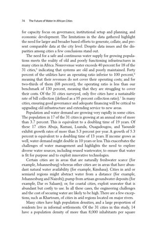 for capacity focus on governance, institutional setup and planning, and economic development. The limitations in the data gathered highlight the need for larger and broader based efforts to generate, collate, and pre sent comparable data at the city level. Despite data issues and the disparities among cities a few conclusions stand out. The need for a safe and continuous water supply for growing populations meets the reality of old and poorly functioning infrastructures in many cities in Africa. Nonrevenue water exceeds 40 percent for 18 of the 31 cities,5 indicating that systems are old and poorly maintained. Forty percent of the utilities have an operating ratio inferior to 100 percent,6 meaning that their revenues do not cover their operating costs; and for two-thirds of them (68 percent), the operating ratio is less than our benchmark of 130 percent, meaning that they are struggling to cover their costs. Of the 31 cities surveyed, only five cities have a sustainable rate of bill collection (defined as a 95 percent collection ratio).7 In many cities, ensuring good governance and adequate financing will be critical to upgrading old infrastructure and extending service to new areas. Population and water demand are growing very rapidly in some cities. The population in 17 of the 31 cities is growing at an annual rate of more than 3.7 percent. This is equivalent to a doubling time of 19 years. Of these 17 cities Abuja, Kumasi, Luanda, Ouagadougou, and Yaoundé exhibit growth rates of more than 5.3 percent per year. A growth of 5.3 percent is equivalent to a doubling time of 13 years. If income grows as well, water demand might double in 10 years or less. This exacerbates the challenges of water management and highlights the need to explore diverse water sources, including reused wastewater, to ensure that water is fit for purpose and to exploit innovative technologies. Certain cities are in areas that are naturally freshwater scarce (for example, Johannesburg) whereas other cities are in areas that have abundant natural water availability (for example, Kinshasa). Cities in arid or semiarid regions might abstract water from a distance (for example, Johannesburg and Nairobi); pump from artisan groundwater deposits (for example, Dar es Salaam); or, for coastal cities, exploit seawater that is abundant but costly to use. In all these cases, the engineering challenges and the cost of securing water are likely to be high. There are a few exceptions, such as Khartoum, of cities in arid regions located on major rivers. Many cities have high population densities, and a large proportion of residents live in informal settlements. Of the 31 cities in this study, 14 have a population density of more than 8,000 inhabitants per square