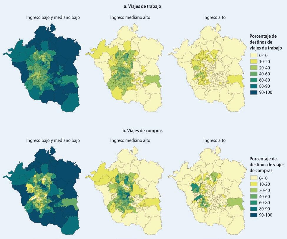 La información sobre la cantidad de viajes y sus características se extrae de la encuesta origen-destino de 2017. Los datos del microcenso de 2015 se utilizan para crear flujos de desplazamiento tanto para el sector formal como para el informal por tipo de habilidad, lo que permite a Ianchovichina y Zárate (2021) estimar las elasticidades de desplazamiento que reflejan la facilidad con que los trabajadores poco calificados y los altamente calificados que viven en distintos lugares de la ciudad pueden pasar del sector informal al formal y viceversa.