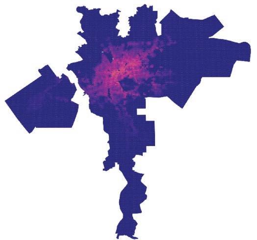 12. To normalize, the number of runs was divided by 60, and the values ≥1 were truncated to be equal to 100 percent. This standardization means the study presents an index of an average number of buses reachable each minute between 8 am and 9 am, at a maximum distance of a 10-minute walk, with the maximum being 1 bus per minute. At 1 bus per minute, the availability index equals 100 percent.