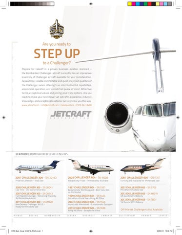 Prepare for takeoff in a proven business aviation standard – the Bombardier Challenger. Jetcraft currently has an impressive inventory of Challenger aircraft available for your consideration. Dependable, reliable, comfortable and quiet are prized qualities of the Challenger series, offering true intercontinental capabilities, economical operation, and unmatched peace of mind. Attractive terms, exceptional values and pricing, plus trade options. Are you ready to make your next move? Let Jetcraft’s experience, industry knowledge, and exceptional customer service show you the way. www.jetcraft.com I info@jetcraft.com I Headquarters +1 919-941-8400