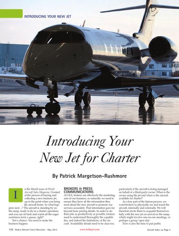 Introducing Your New Jet for Charter By Patrick Margetson-Rushmore n the March issue of World Aircraft Sales Magazine, I looked at the process of buying and collecting a new business jet, up to the point when you bring the aircraft home. So what happens next…? The aircraft is standing by on the ramp, ready to fly in a charter operation, and you can sit back and watch all the eager customers form a queue, right? Not a chance. You need to make the business happen.