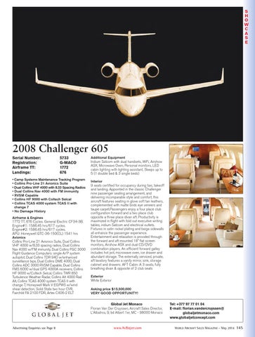 Tel: +377 97 77 01 04 E-mail: florian.vandercruyssen@ globaljetmonaco.com www.globaljetconcept.com WORLD AIRCRAFT SALES MAGAZINE – May 2014