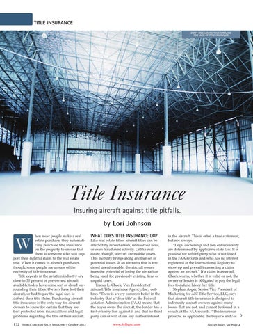Title Insurance Insuring aircraft against title pitfalls. by Lori Johnson hen most people make a real estate purchase, they automatically purchase title insurance on the property to ensure that there is someone who will support their rightful claim to the real estate title. When it comes to aircraft purchases, though, some people are unsure of the necessity of title insurance. Title experts in the aviation industry say close to 30 percent of pre-owned aircraft available today have some sort of cloud surrounding their titles. Owners have lost their aircraft, or had to pay the legal fees to defend their title claim. Purchasing aircraft title insurance is the only way for aircraft owners to know for certain that they are best protected from financial loss and legal problems regarding the title of their aircraft.
