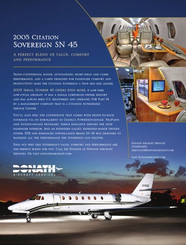 2005 Serial Number 45 offers even more. A low-time, low-cycle aircraft, it has a single corporate-owner history and has always been U.S. registered and operated FAR Part 91 by a management company that is a Citation Authorized Service Center. You’ll also feel the confidence that comes with front-to-back coverage via its enrollment in Cessna’s PowerAdvantage, ProParts and AuxAdvantage programs. Simple elegance defines the nine passenger interior. And an extended galley, extended-range oxygen system, FDR and enhanced surveillance means SN 45 was designed to maximize all the performance the Sovereign can deliver. Find out why this Sovereign’s value, comfort and performance are the perfect blend for you. Call Jim Donath at Donath Aircraft Services. Or visit donathaircraft.com