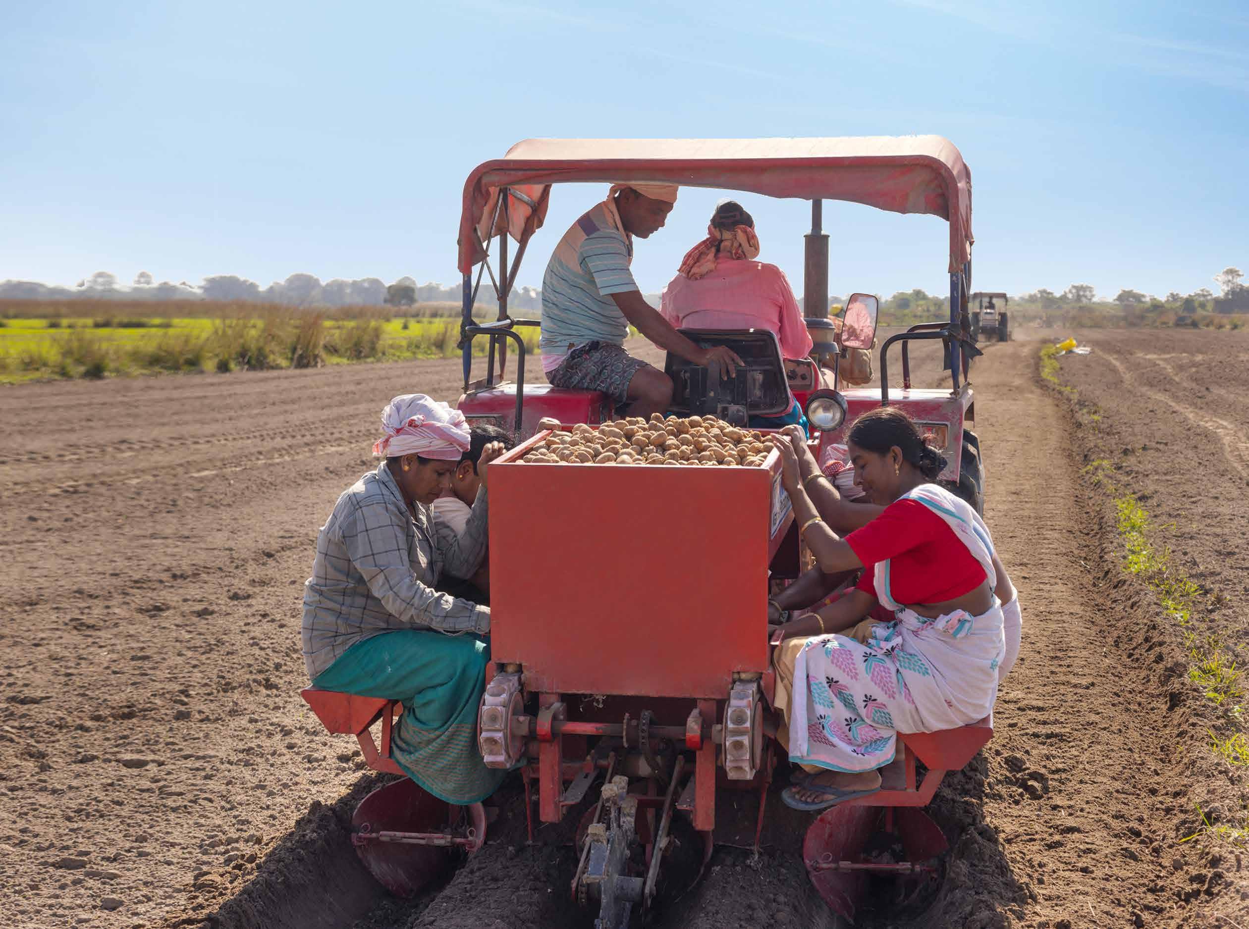 On a pleasant December morning, 37-year-old farmer Kamal Kumari, set out from her home to the fields bordering her village in the northeastern state of Assam. As she walked through vast paddy and mustard fields, she could see the faint outline of the majestic Himalayas in the distant horizon. Kamal was joined by other women farmers, and together they reached a large plot of land. Taking charge of the bright yellow seeder machine, Kamal climbed onto the driver's seat, while her companions filled the back of the tiller with potato seeds. Throughout the day, they ploughed through the field planting the potato seeds.