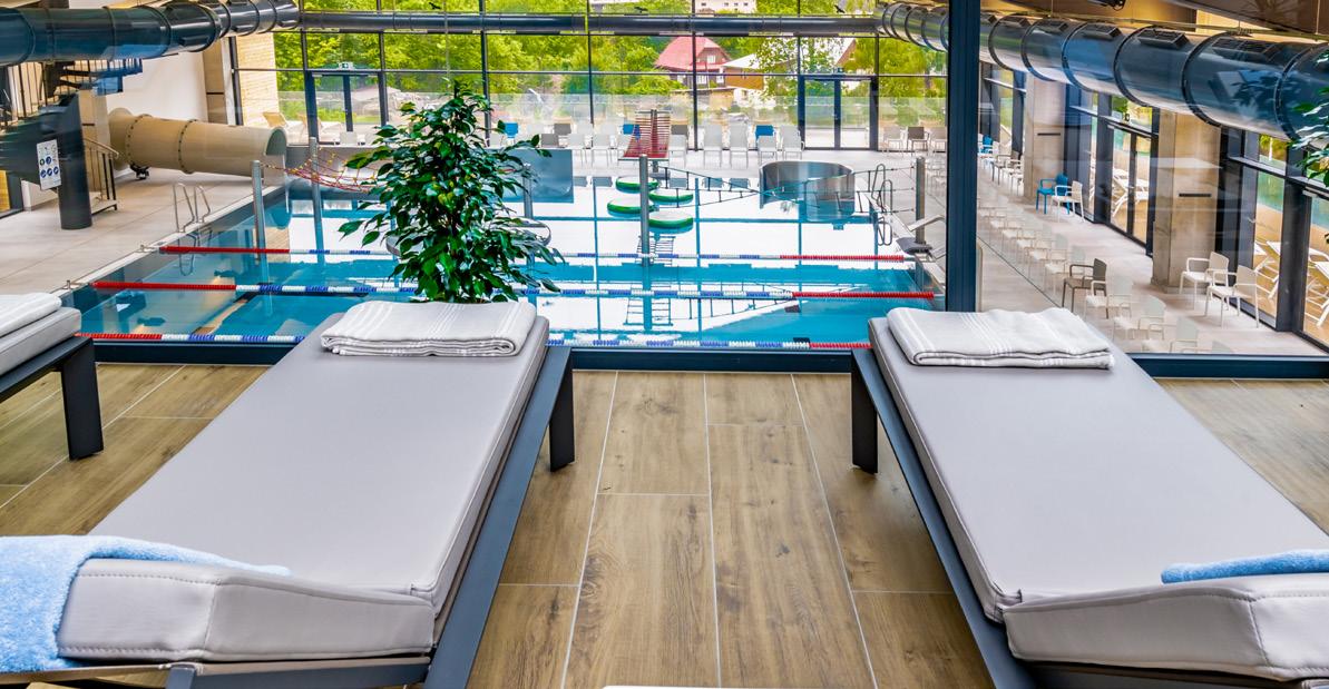 At the Water World guests can enjoy a swimming pool with water massage beds, water cascades, bubble bath, rope items, rocking bay and wild water. An entertaining children’s swimming pool with a slide and other water elements. In the modern sauna world, guests can look forward to a BIO sauna, steam, finnish and infrared sauna, an exclusive separate relaxation room, outdoor cooling pool, outdoor showers, terraces with a panoramic view of the country.