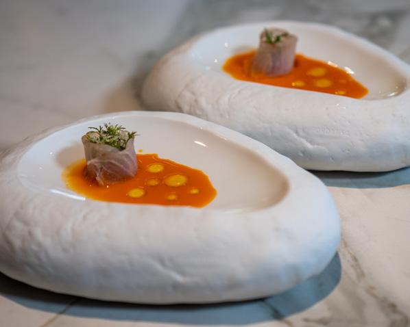 The gorgeous dining room features four open studio kitchens, allowing their guests to enjoy the sights and sounds of the culinary artistry on display. Their two large, shared chef’s tables in the heart of the open studio kitchens offer guests a fantastic opportunity to watch their chefs prepare the food and thus become part of a unique culinary experience.