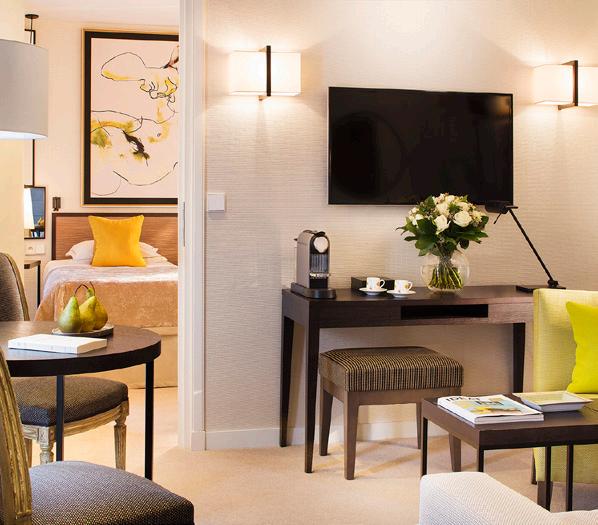 The hotel was completely renovated in 2014 by the Interior Designer Michel JOUANNET and is housed in a typical 19th century Haussmanian house with wrought iron balconies. It has 50 rooms, elegant suites and luxury apartments. The hotel characterizes Parisian elegance. A contemporary, refined classic place, like the apartment of an individual, where the quality of the materials, the comfort, the works of art and the found objects prevail.