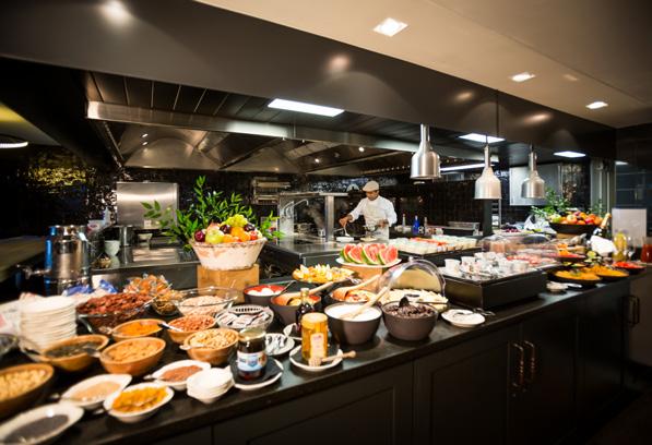 An interactive kitchen offers guests the opportunity to have their food cooked just the way they like it. The innovative bartenders have earned their glory with many a unique mix of liquid flavors and amazing flaring.