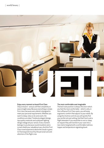 LUFTH Enjoy every moment on board First Class Step on board – and you will feel completely at ease straight away. Because everything is simply first-class; because every detail is designed to meet your personal requirements. Whether you want to sleep, relax or do some work, the conditions are ideal. Timelessly elegant design, top-quality materials and a pleasant lighting design indulge all your senses. Every moment belongs to you because sound insulation and a screen shield your valuable privacy. And this First Class travel experience above the clouds is given its final exquisite touch by the personal care and aention of the flight crew.