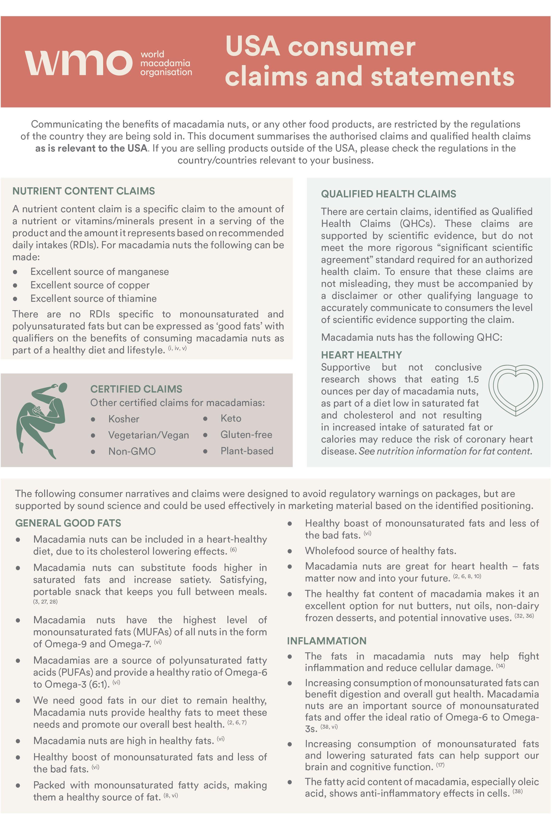 Communicating the overall benefits of macadamia nuts or other food products is limited in the United States to only those qualified health claims or authorized nutrient content.