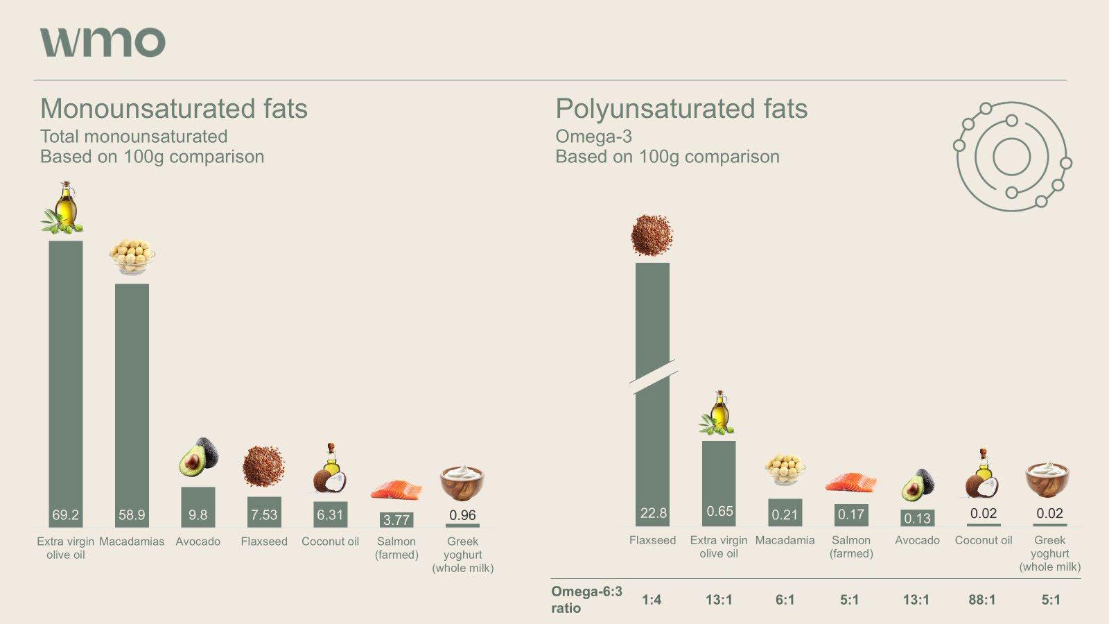 • Fatty acid profile breakdown, including ratios between monounsaturated and polyunsaturated fats