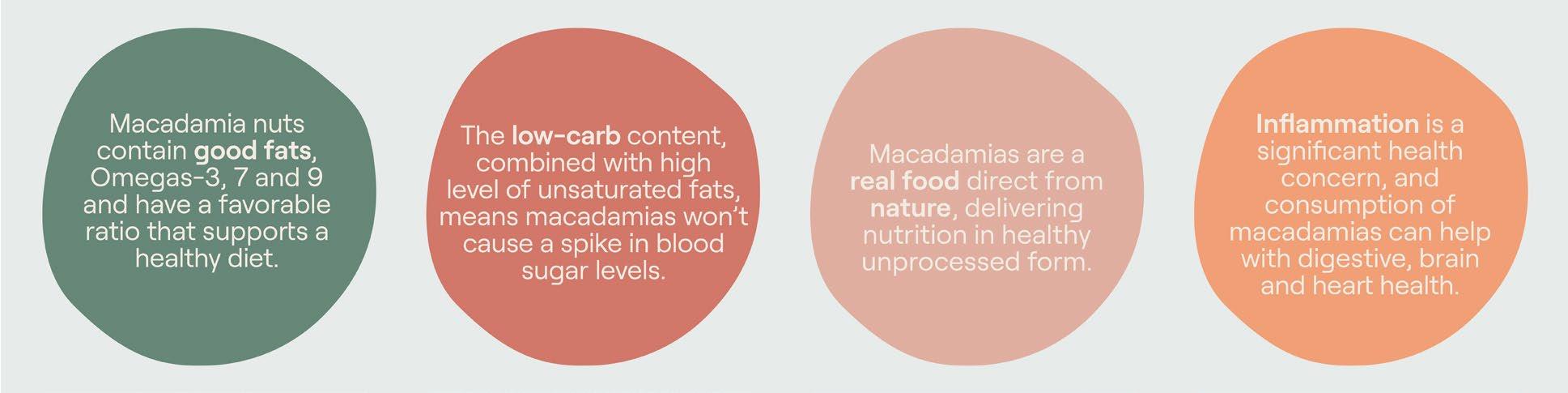 Macadamias have a nutritional profile that is aligned with the growing consumer trend of improving health through whole foods that have key benefits when consumed as part of an overall healthy diet Macadamias have a range of health benefits Scientific research has demonstrated that their nutritional benefits include improved cardiovascular health, reduced inflammation, improved glucose response, and a satiated feeling without weight gain. Overall, this report details the assessment of the health benefits of macadamia nuts, the importance of their nutrients, scientific reviews, and summarises an industry-aligned nutritional narrative to evolve consumer understanding over time.