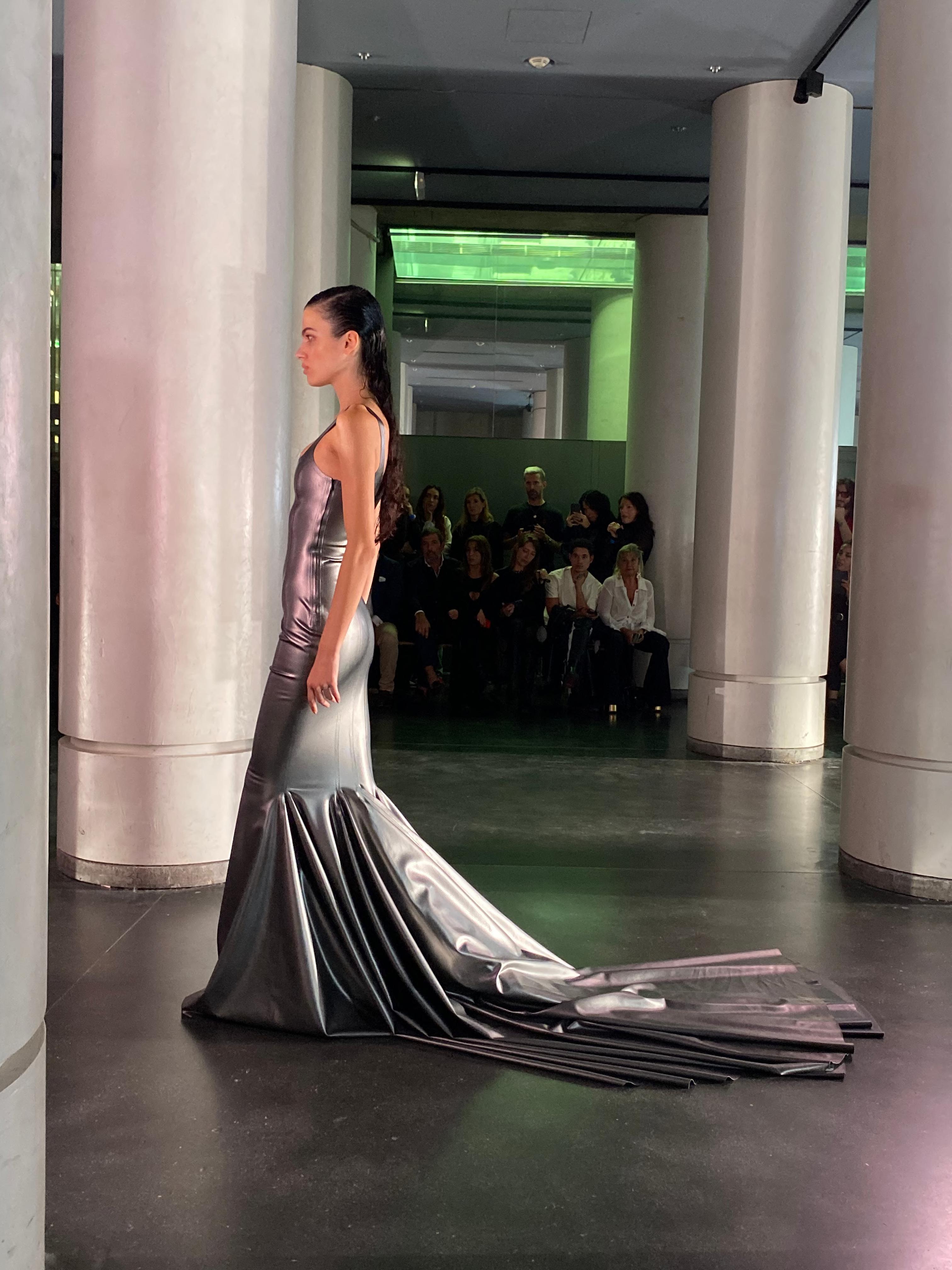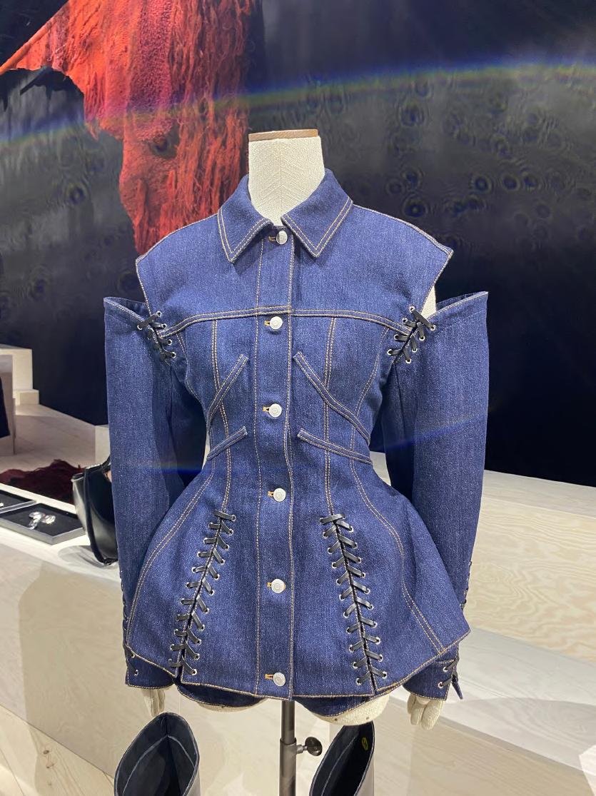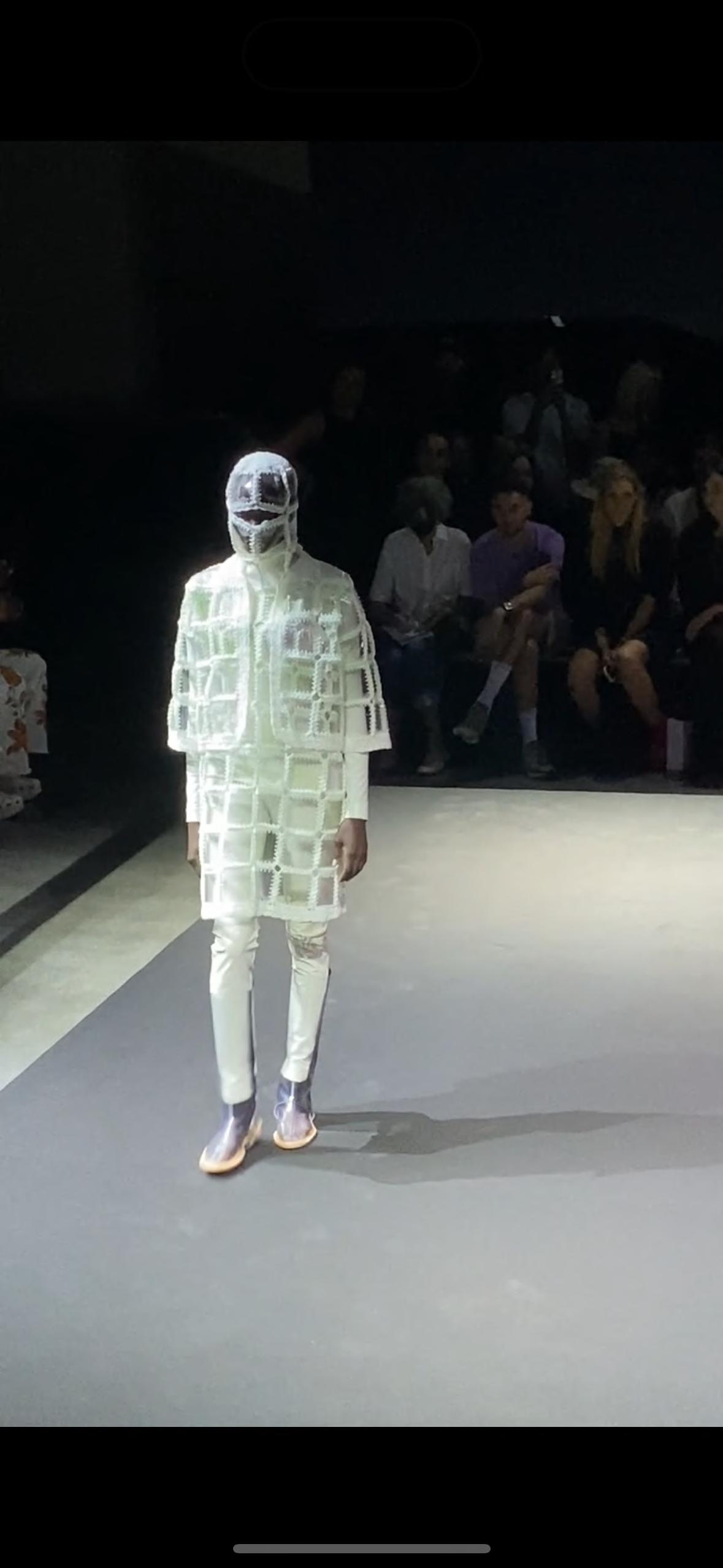 Many sustainable materials were introduced to the fashion world for the first time at the show For example, Stella partnered with Keel Lab to incorporate Kelsun, a revolutionary seaweed-based yarn, into two striking knit dresses Kelsun, currently being developed as a cotton-based alternative, uses zero pesticides in its production and 70x less water than cotton It is not yet commercially viable but was hand-crocheted onto the Stella pieces - a unique example of how the most advanced technologies can complement traditional artisanal handiwork to progress the fashion industry while still embracing its heritage. The Kelsun dresses, and a pair of blue jeans, were studded with dozens of iridescent platinum mirrors and worn with oversized pearls. The mirrors were the result of a long-awaited collaboration with Andrew Logan. “I grew up knowing him he’s very much pop art, a little bit of the Blitz Club, a little bit New Romantic,” Stella said “He was always around in my parents’ group, and I’ve always been a massive massive fan ”