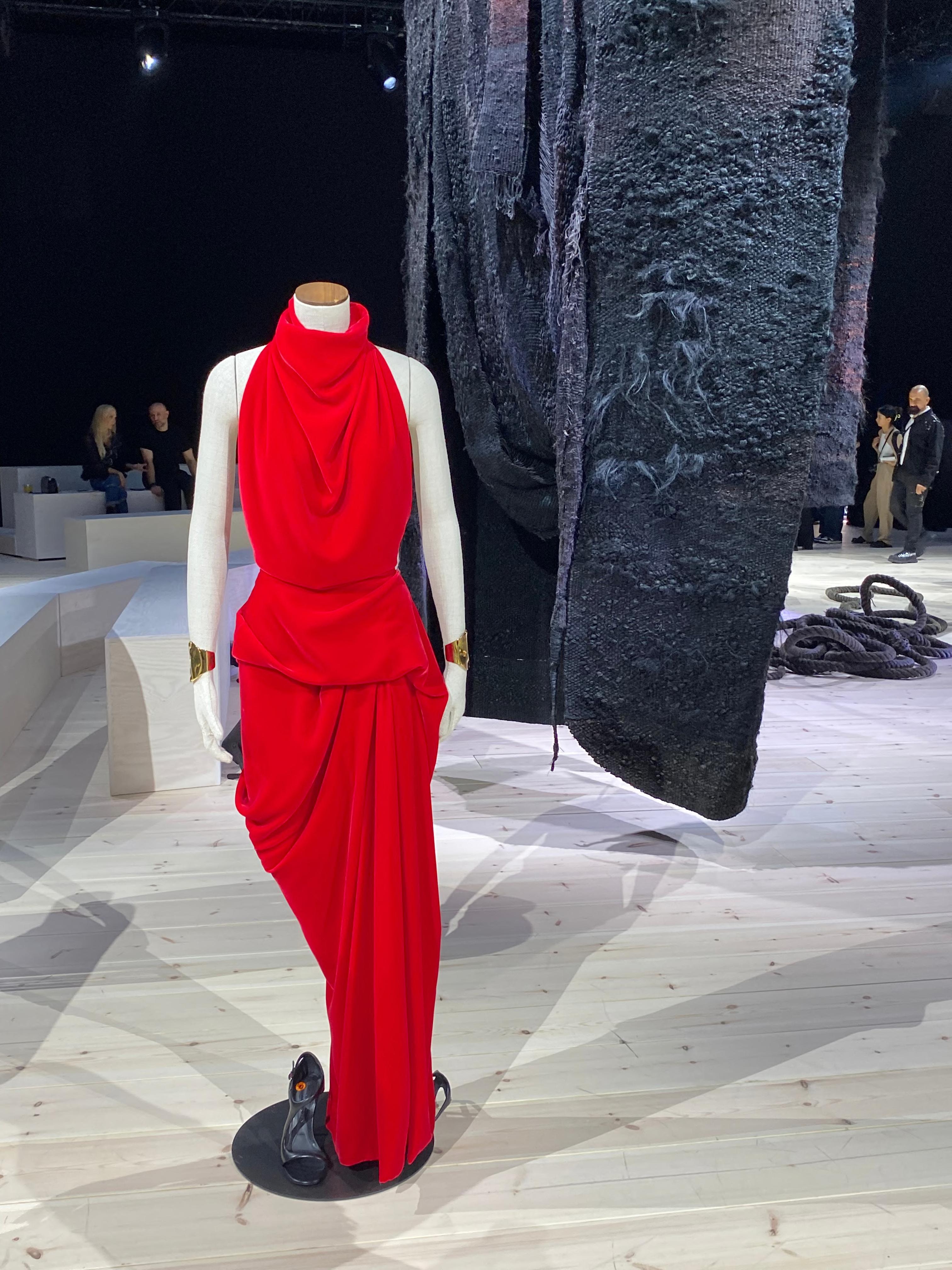 The collection, entitled “Anatomy II,” was, first and foremost, a tribute to Lee It was described by Burton as “dedicated to the memory of Lee Alexander McQueen, whose wish was always to empower women, and to the passion, talent, and loyalty of my team ” With this message of empowerment In mind, Burton structured the season around four major themes. The blood red rose and female anatomy itself were recurring leitmotifs of feminine strength. Meanwhile, Burton also sourced inspiration from two powerful, if vastly differing, historical personalities. One, Queen Elizabeth I, indelibly shaped history while leading the mightiest empire of her time The other, Polish artist Magdalena Abakanowicz, overcame tremendous personal and professional adversity to become a leading voice in her country’s modernist art movement